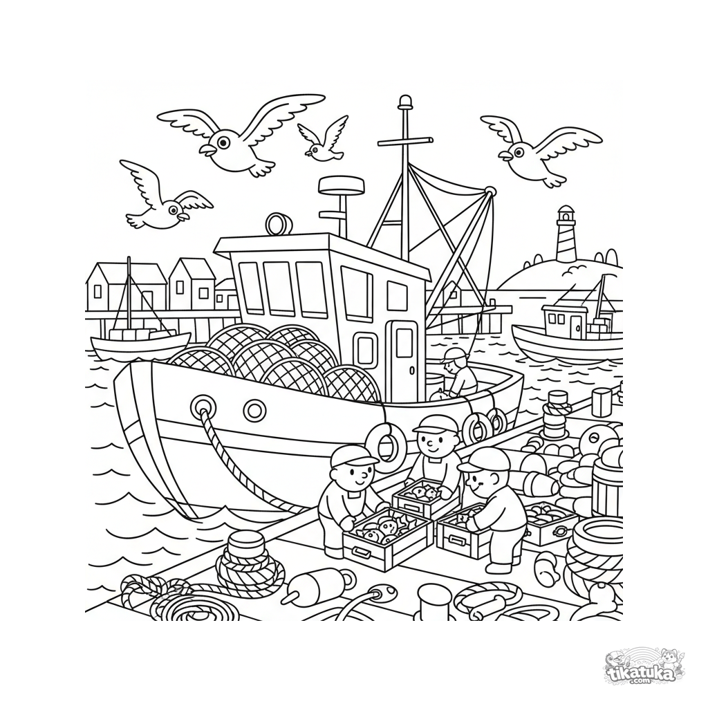 Página para colorir para pré-adolescentes de 7 a 9 anos: uma traineira pesqueira colorida descarregando no cais movimentado. Cena no estilo vetor plano.