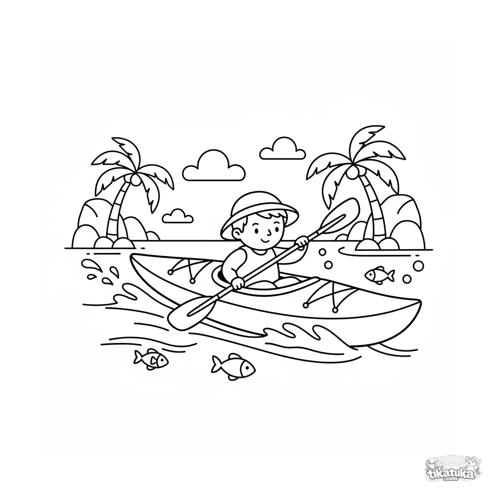 Página para colorir para crianças 4-6: um caiaque rápido corre por uma baía tropical. Formas brilhantes e limpas e uma pose dinâmica.