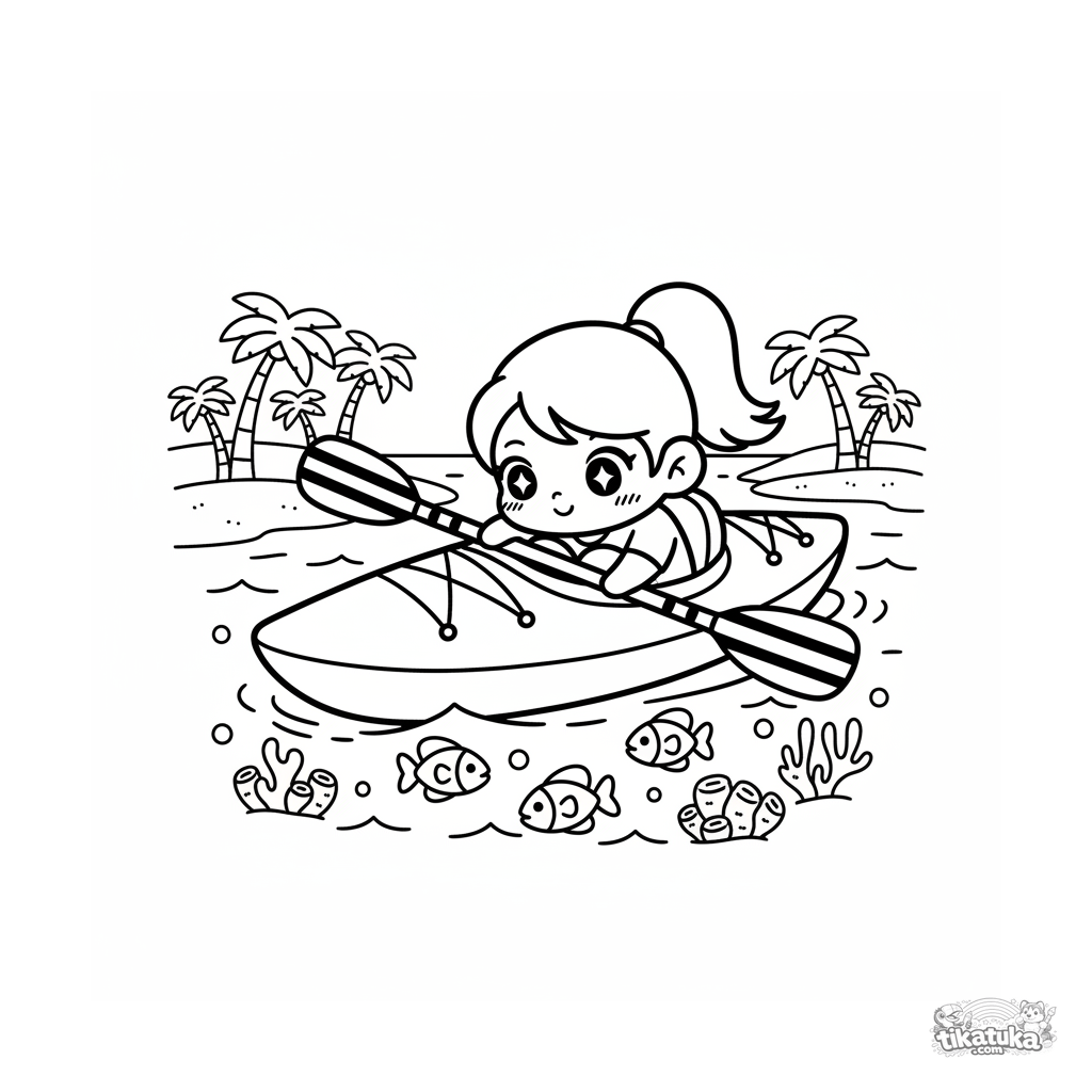 Página para colorir para crianças de 4-6 anos: um caiaque colorido flutua na água clara de uma baía tropical. O remador olha para peixes e corais, coqueiros na praia.