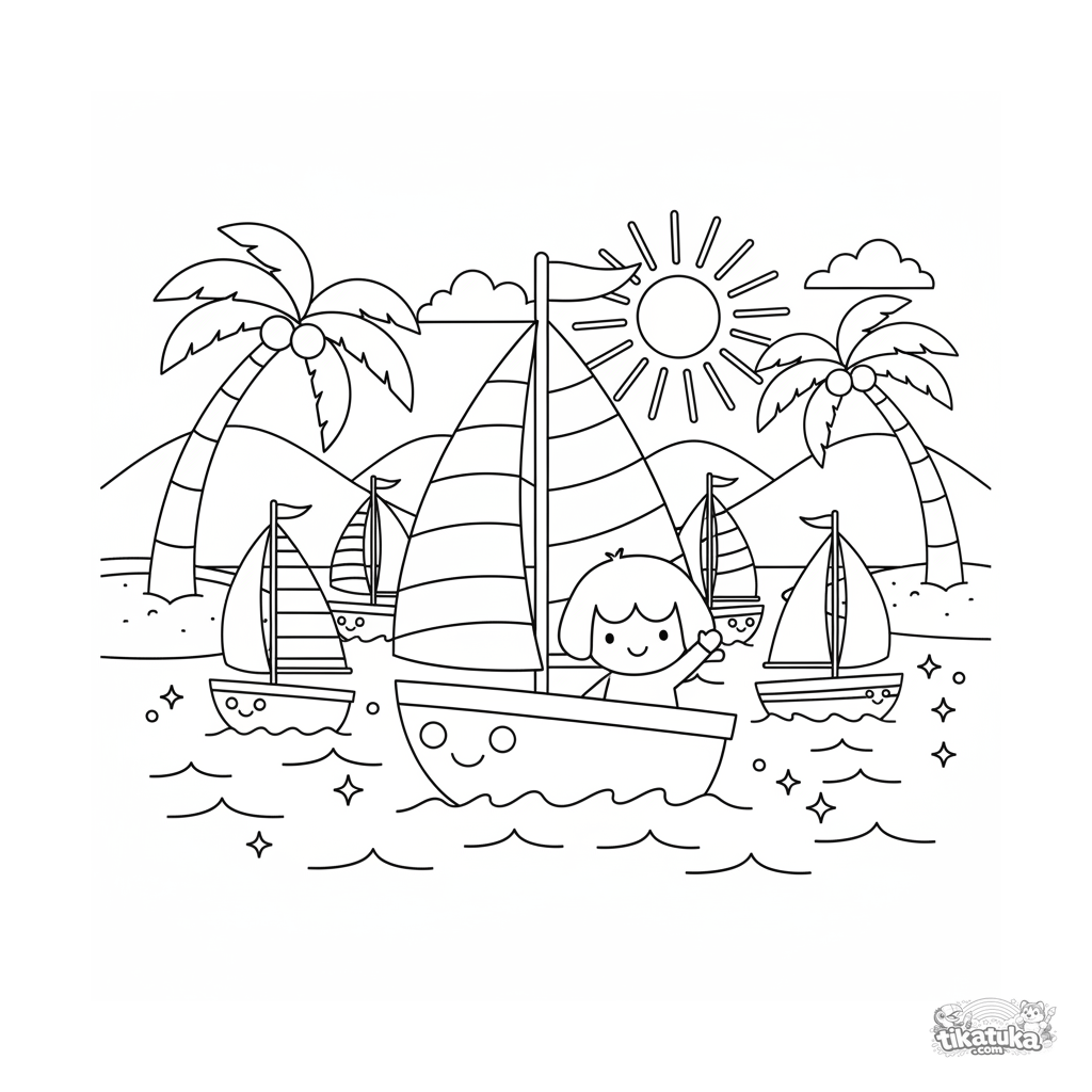 Página para colorir para crianças de 4-6 anos: uma animada regata de veleiros coloridos em uma baía tropical ensolarada. Cena brilhante com coqueiros e praia.