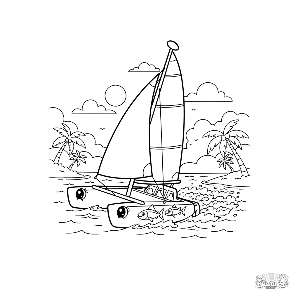 Página para colorir para pré-adolescentes 7-9: um catamarã de corrida rápido com gráficos de peixe-vela cruza uma baía tropical.