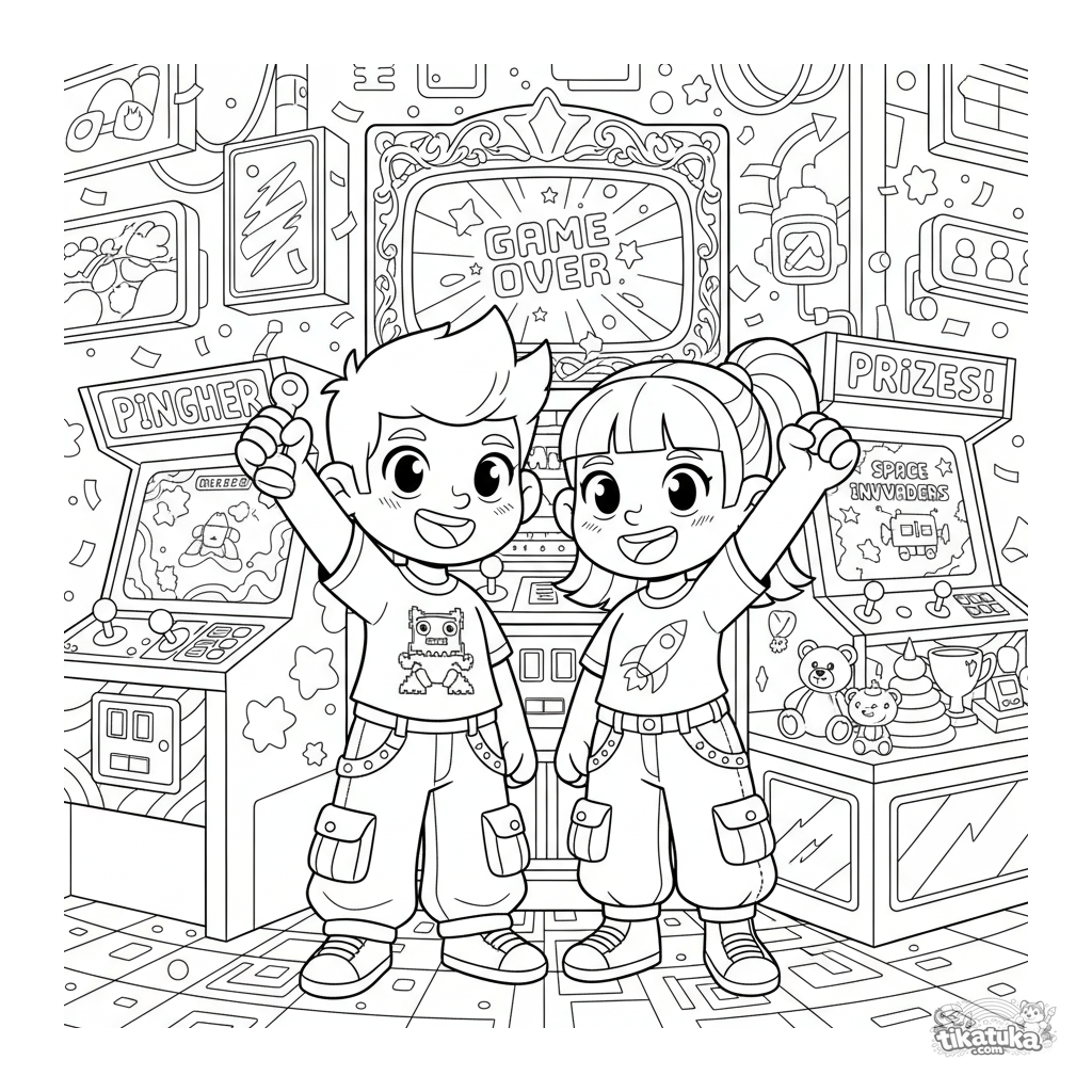 Página para colorir estilo quadrinhos para crianças de 7 a 12 anos: dois gamers retro comemorando uma vitória em uma sala de fliperama cheia de máquinas. Cena dinâmica e detalhada.