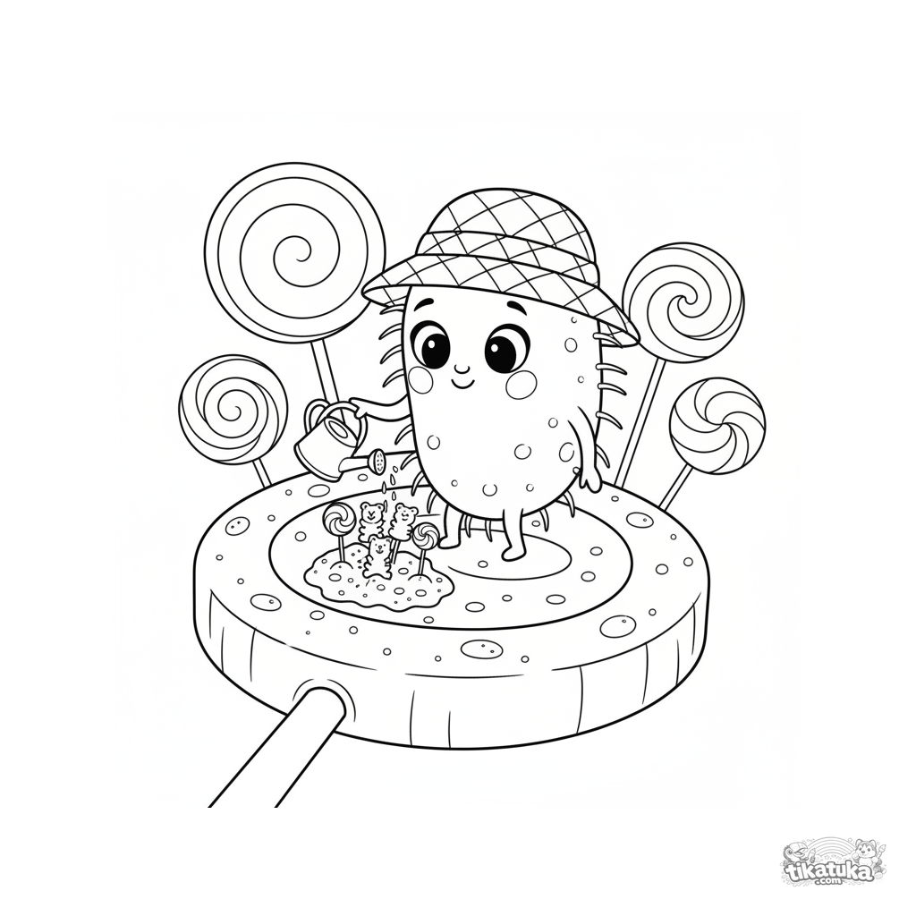 Página para colorir para crianças de 4-6 anos: um micróbio vírgula jardineiro rega brotos de doces em um pirulito. Estilo livro de histórias aconchegante.