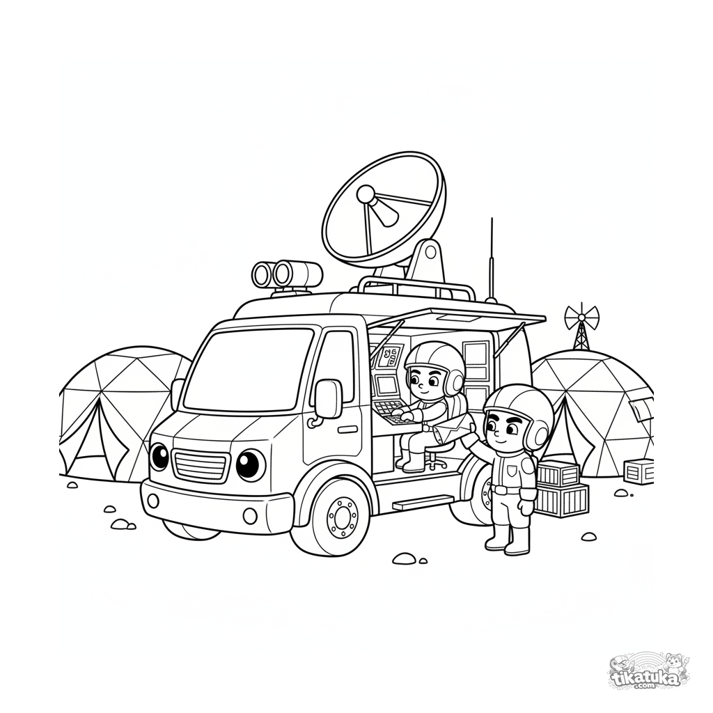 Página para colorir de um caminhão de comunicações futurista em um QG de campo. Para crianças de 7 a 9 anos.