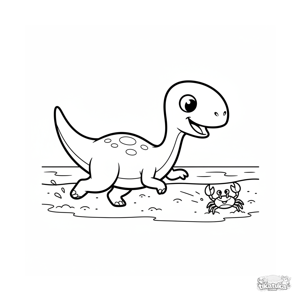 Página simples para colorir para bebês 2-3 anos: um minúsculo compsognato corre pela areia molhada de uma praia antiga, perseguindo um caranguejo.