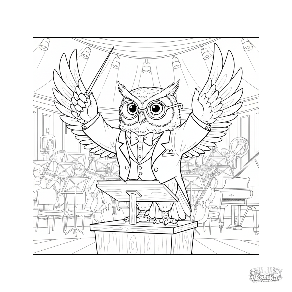 Página para colorir detalhada para crianças mais velhas de 10-12 anos: uma coruja sábia de fraque conduz uma orquestra do pódio no grande palco de uma sala de concertos.