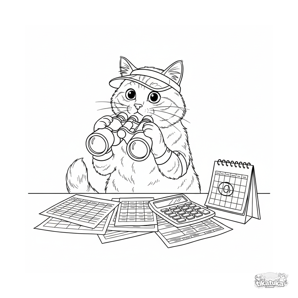 Página para colorir para crianças 10-12: um gato contador confuso em uma mesa bagunçada olha através de binóculos ao contrário. Meme detalhado sobre vida de escritório e salário.