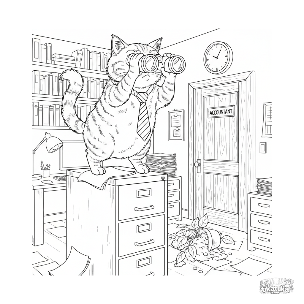 Página para colorir para crianças de 10-12 anos: um gato de escritório confuso sobe em um arquivo para usar binóculos, encarando a porta do contador. Cena de meme detalhada em estilo graphic novel.