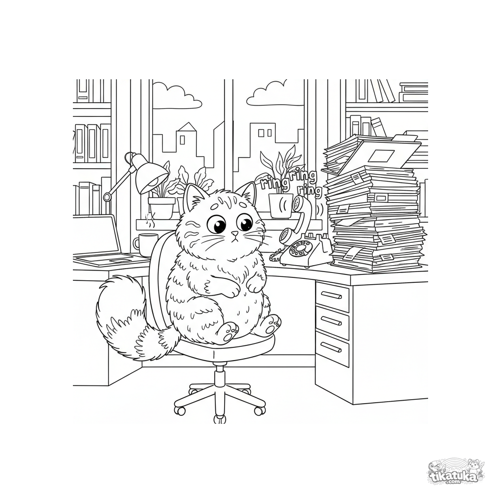 Página para colorir para crianças mais velhas: um gato confuso em um escritório encara um telefone tocando e uma pilha instável de pastas. Cena engraçada detalhada em estilo de quadrinhos.