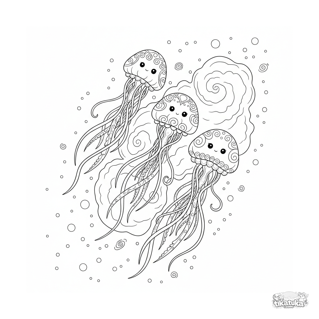 Página para colorir para 10-12 anos: criaturas alienígenas graciosas que se assemelham a águas-vivas flutuam através de uma nebulosa no espaço sideral. Linhas fluidas intrincadas no estilo art nouveau lite.