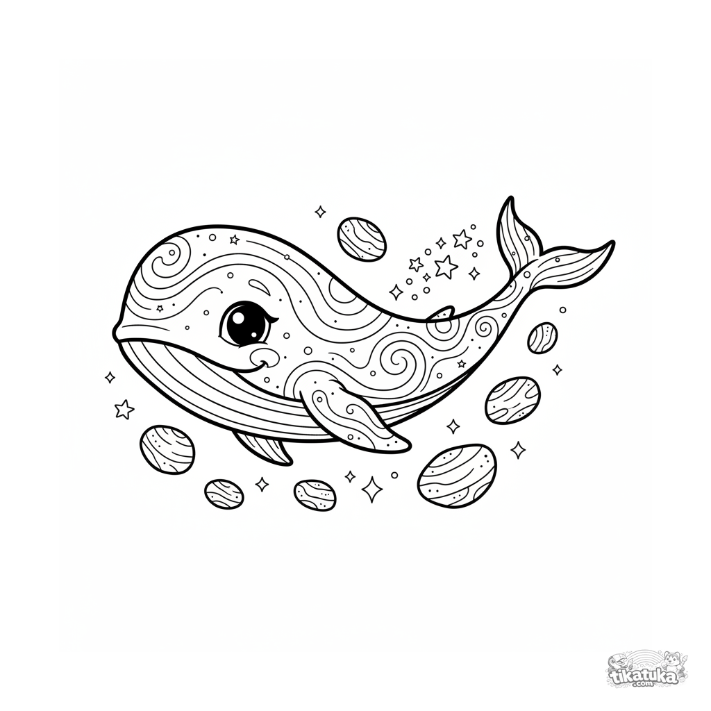 Página para colorir para 7-9 anos: uma baleia cósmica majestosa com pele de nebulosa nada por um cinturão de asteroides entre estrelas. Linhas fluidas.