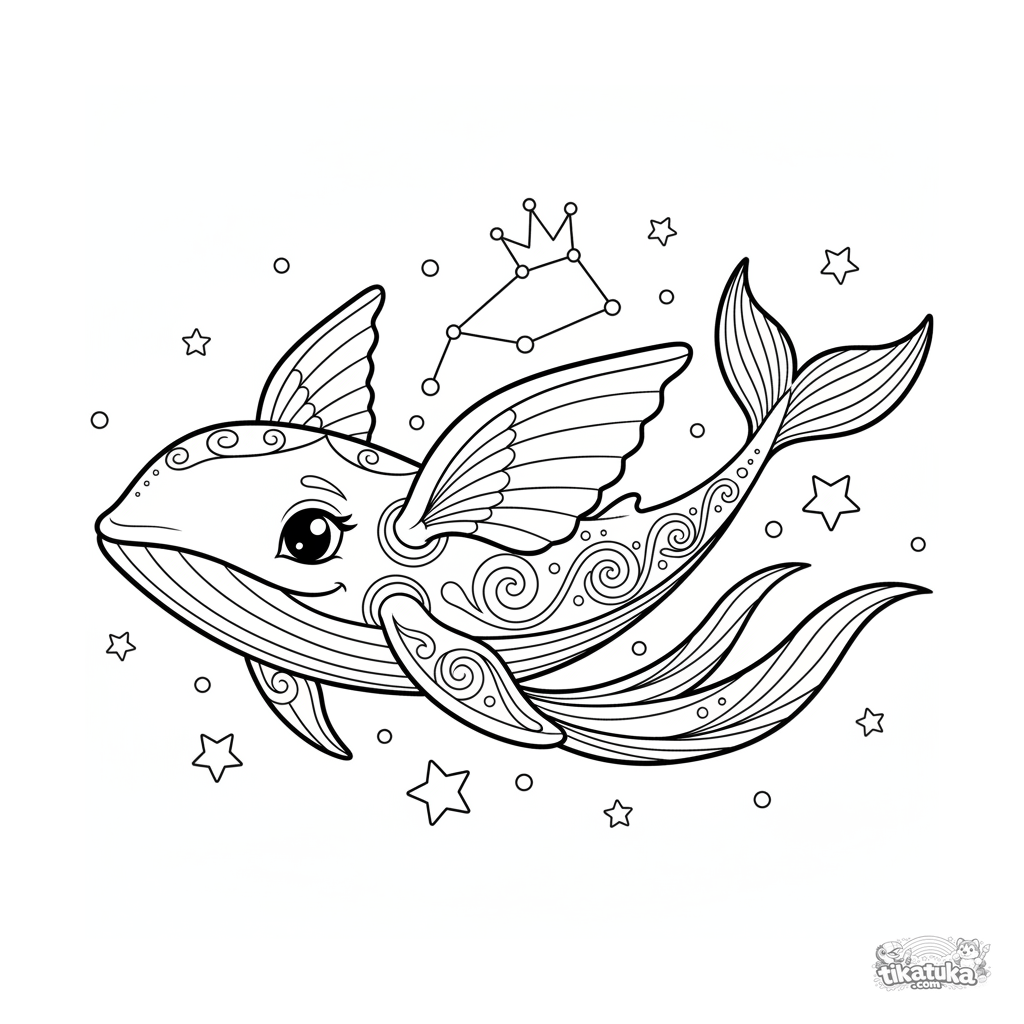 Página para colorir detalhada para 10-12 anos: uma baleia cósmica majestosa com padrões corporais nada por um campo estelar e uma constelação. Linhas fluidas e artísticas.