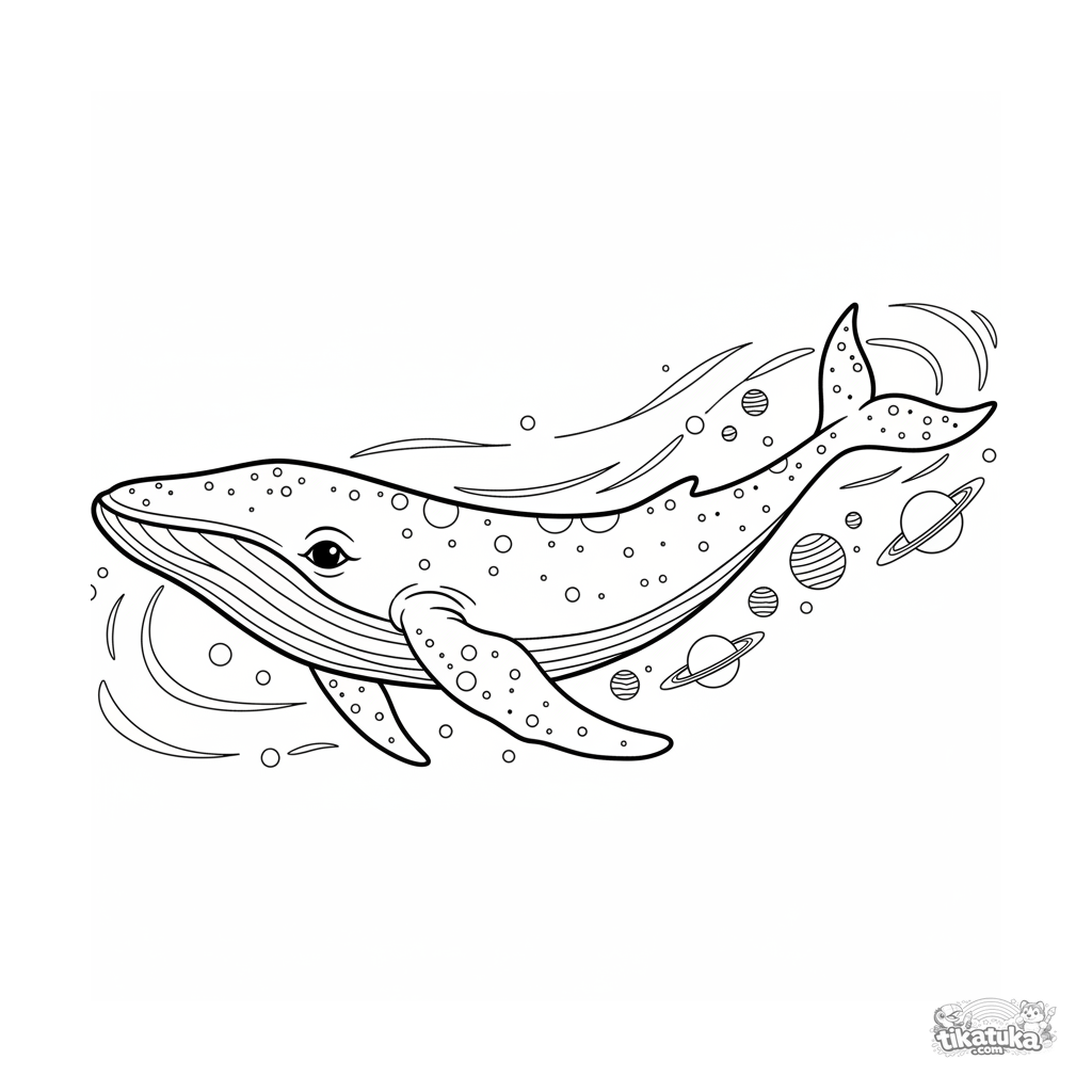 Página para colorir detalhada para crianças mais velhas 10-12: uma baleia cósmica realista nada pelos contornos de uma nebulosa estelar no espaço sideral. Trabalho de linha intrincado.