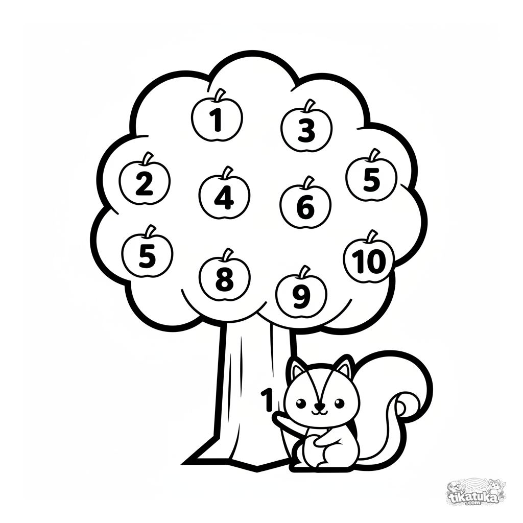 Página educativa para colorir para crianças pequenas: conte maçãs de 1 a 10 em uma árvore com um esquilo. Formas simples.