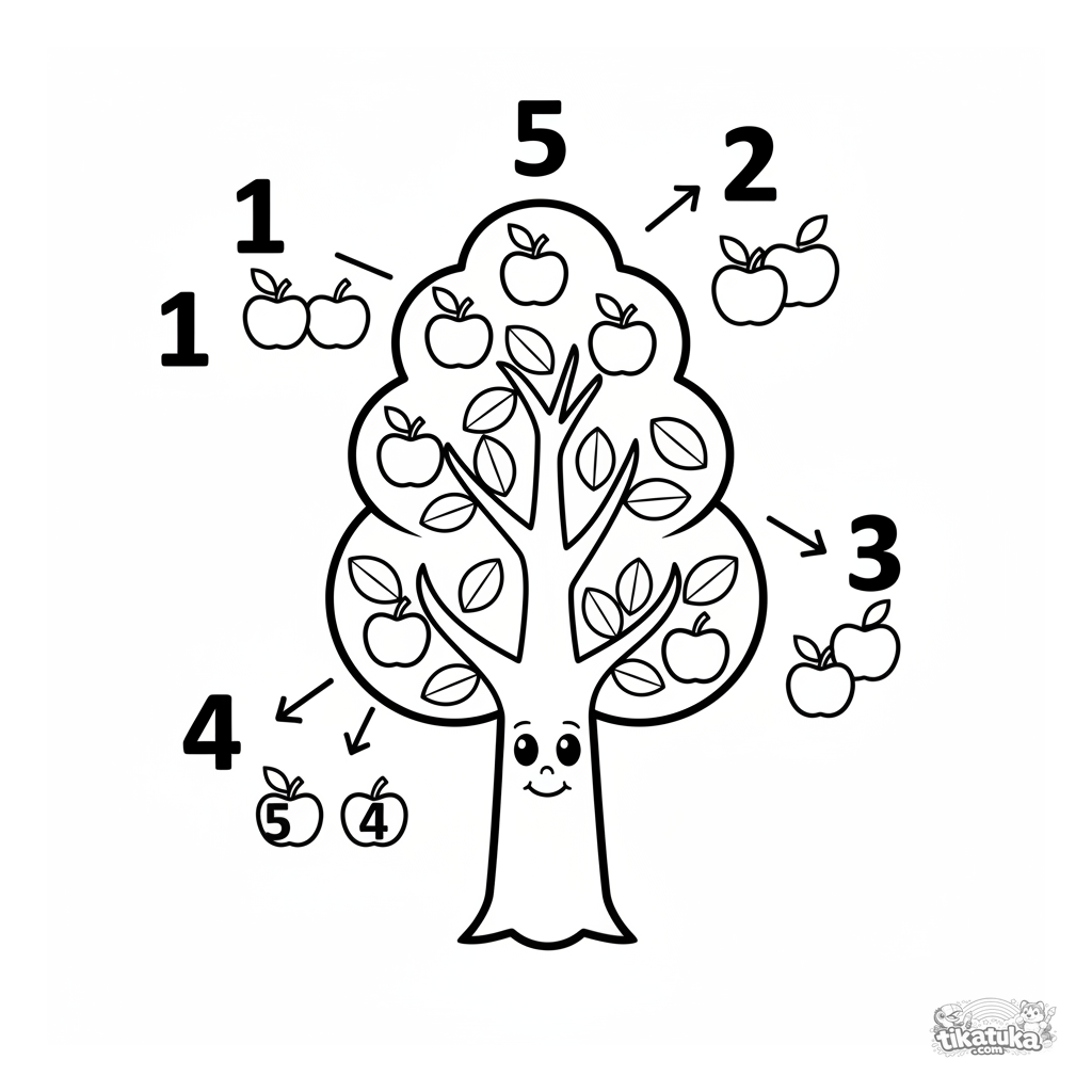 Página para colorir educativa para bebês de 2-3 anos. Uma macieira com maçãs e números de 1 a 5 ajuda a aprender a contar. Formas simples.
