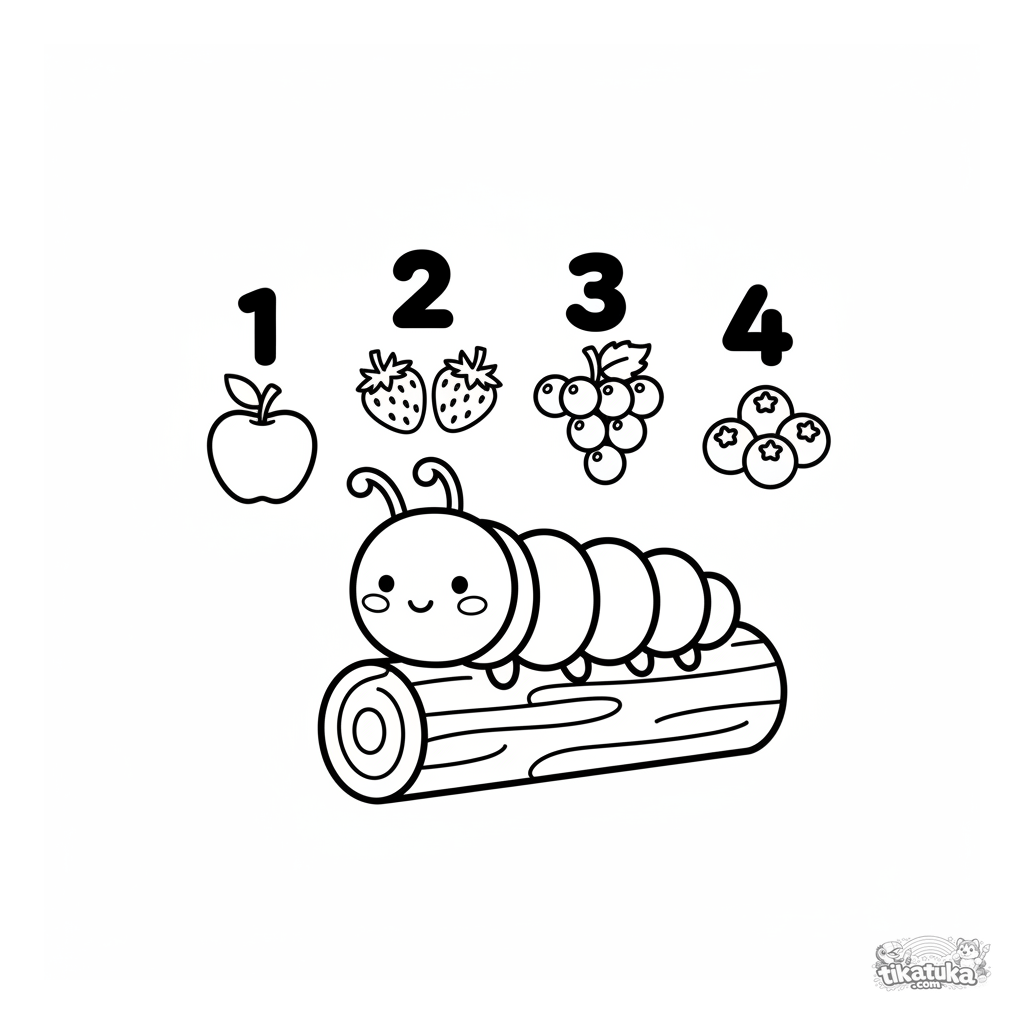 Página educativa para colorir para crianças pequenas: uma lagarta alegre ajuda a contar frutas de um a quatro. Formas grandes e simples.