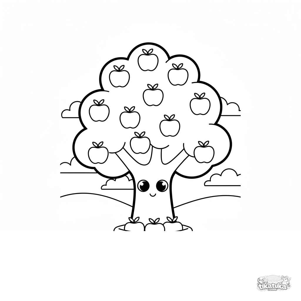 Página educativa para colorir para crianças 4-6: uma macieira com dez maçãs e uma cesta com mais três na base ajuda a praticar a contagem.