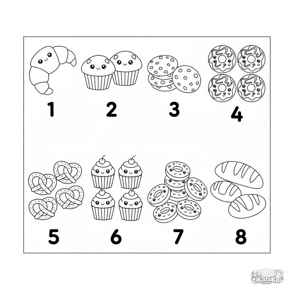 Página para colorir educativa tipo folha de adesivos para crianças pequenas de 2-3 anos: conte de 1 a 8 itens diferentes de padaria. Formas simples, números claros, perfeito para primeiras lições de contagem.