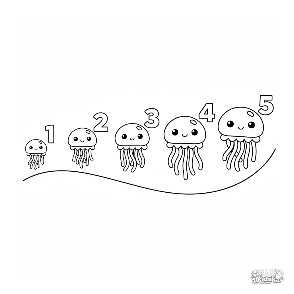 Página simples para colorir para crianças pequenas de 2-3 anos: aprenda a contar com águas-vivas arco-íris em uma corrente oceânica, numerais grandes de 1 a 5.