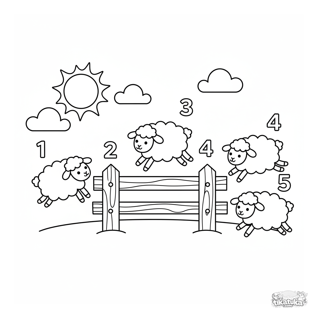Página educativa para colorir para bebês de 2-3 anos: ovelhas fofas pulam uma cerca uma por uma, com números de 1 a 5 para praticar contagem.