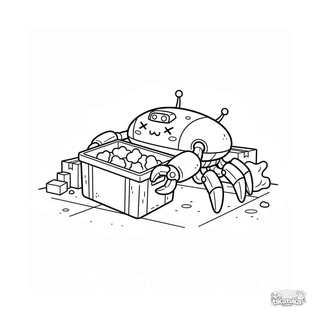 Página para colorir de um robô carregador tipo caranguejo levantando um caixote em um armazém. Para crianças de 7 a 9 anos.