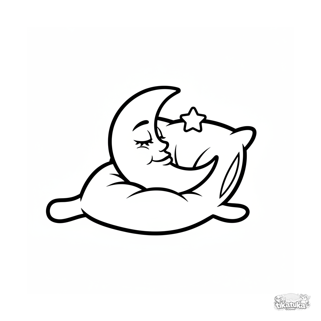 Página para colorir para bebês: uma lua crescente embalada dorme profundamente em um travesseiro macio. Linhas curvas suaves e um tema calmo são adequados para colorir antes de dormir.