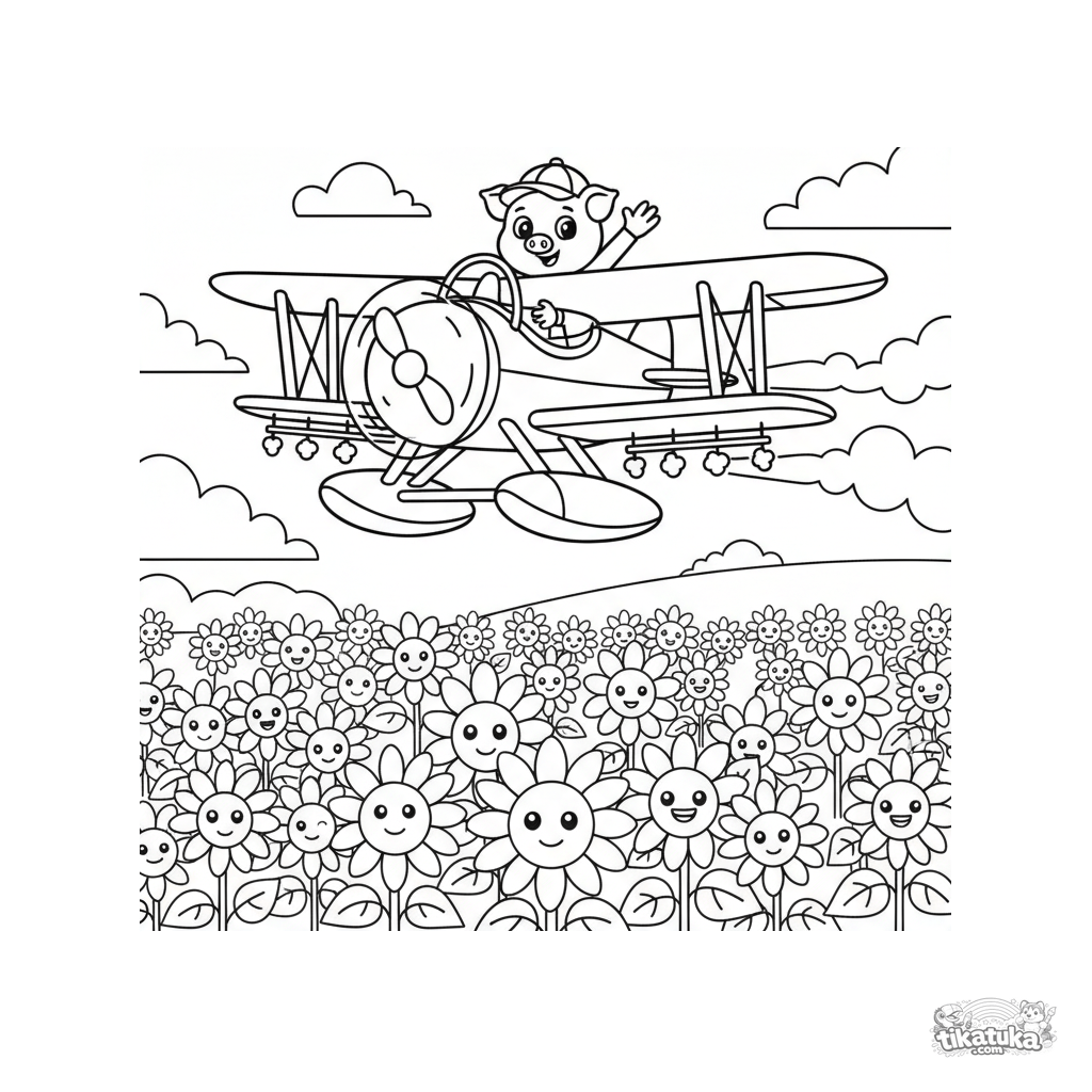 Página simples para colorir para bebês: um biplano agrícola voa sobre um campo de girassóis. Formas grandes, piloto porco acenando. Para 2-3 anos.
