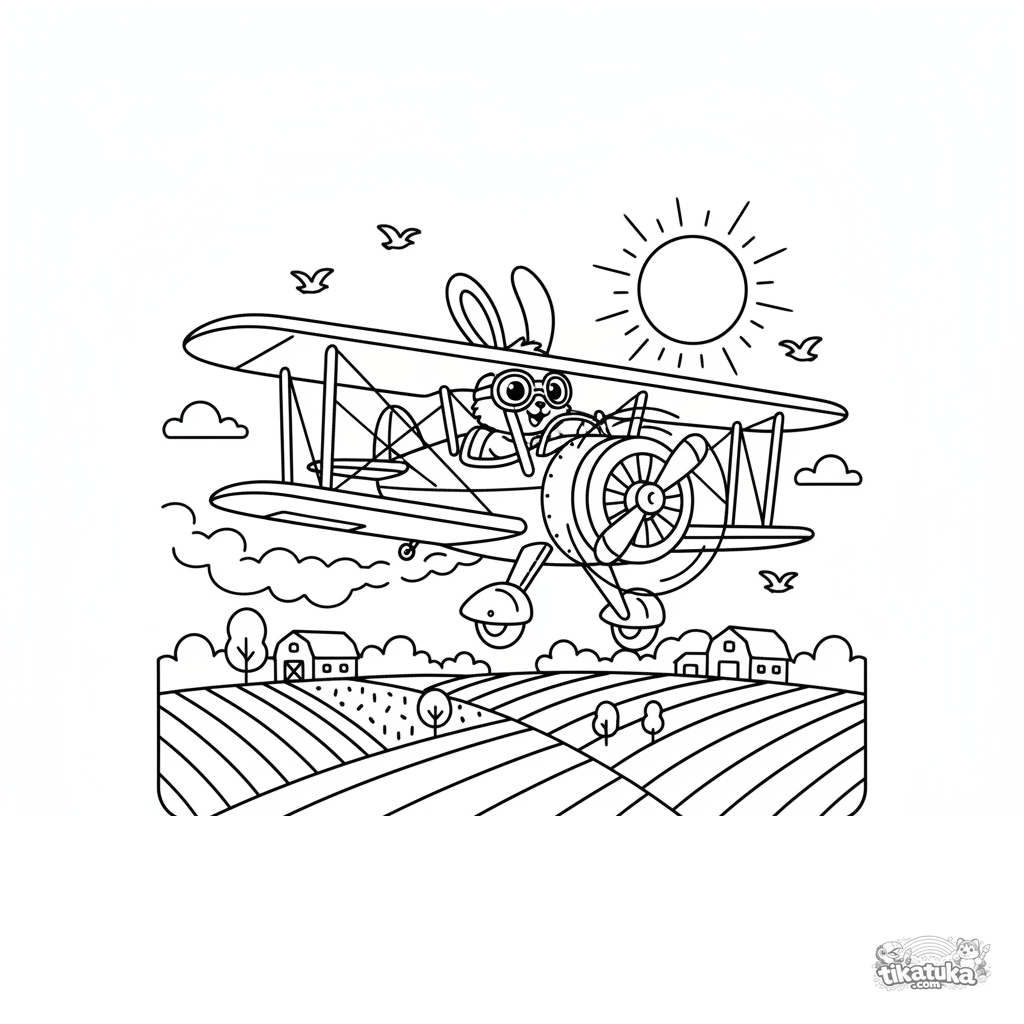 Página para colorir de um biplano pulverizador voando baixo sobre campos, pilotado por um coelho com óculos. Para crianças de 4 a 6 anos, com formas simples.