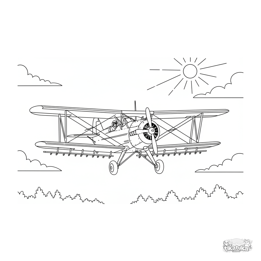 Página para colorir para crianças de 7-9 anos: um biplano pulverizador voando contra um céu de pôr do sol. Silhueta clara com detalhes.