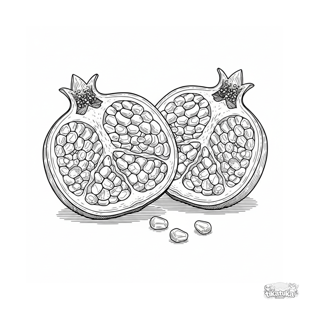 Página para colorir complexa para maiores 10-12: um corte botânico detalhado de uma romã mostrando sementes e membranas. Estilo de gravura vintage.