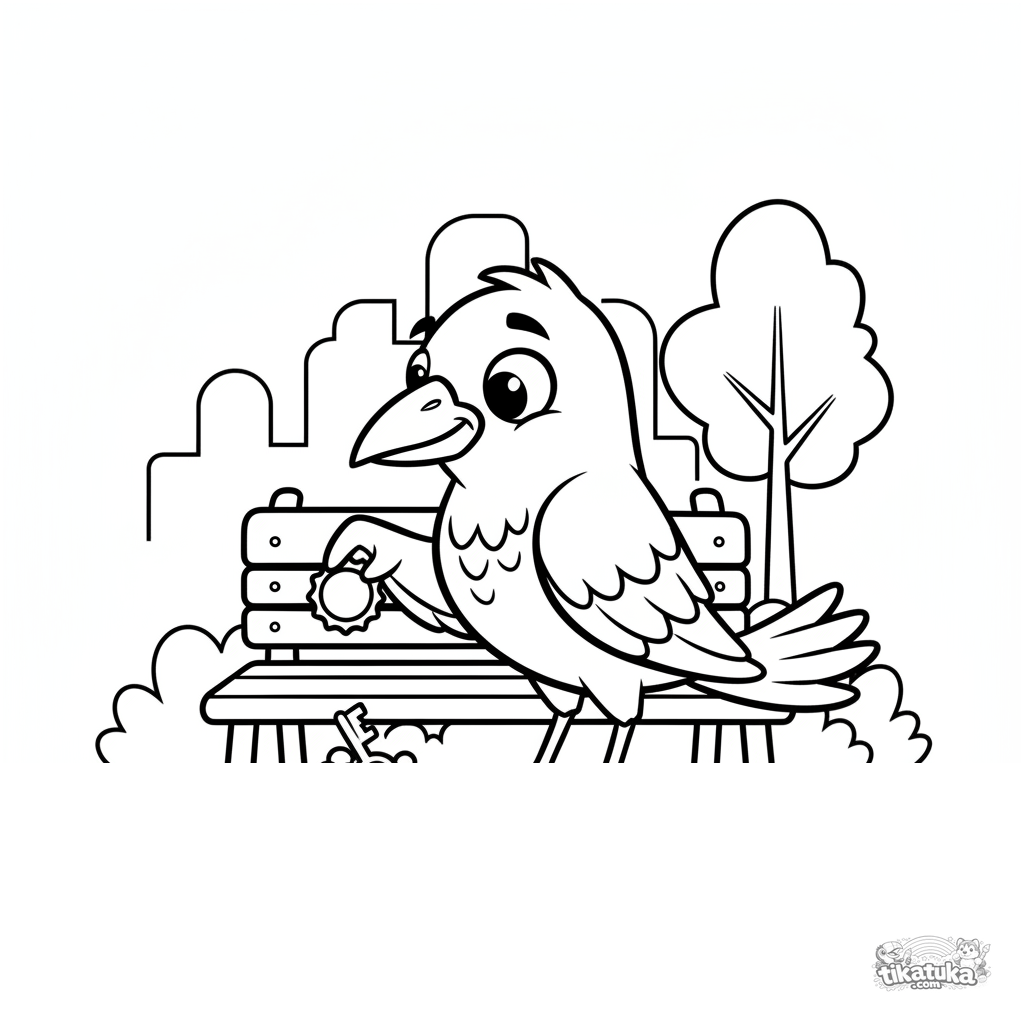 Página para colorir infantil: um corvo esperto colecionando bugigangas brilhantes em um parque da cidade. Estilo de recorte de papel.
