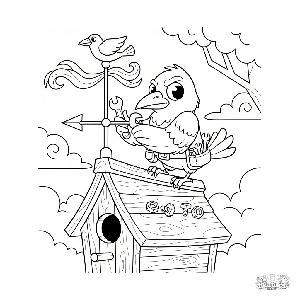 Página para colorir para 10-12 anos: um astuto corvo mecânico repara um cata-vento em uma casa de pássaros. Cena detalhada no estilo cartoon dos anos 90 com ferramentas.