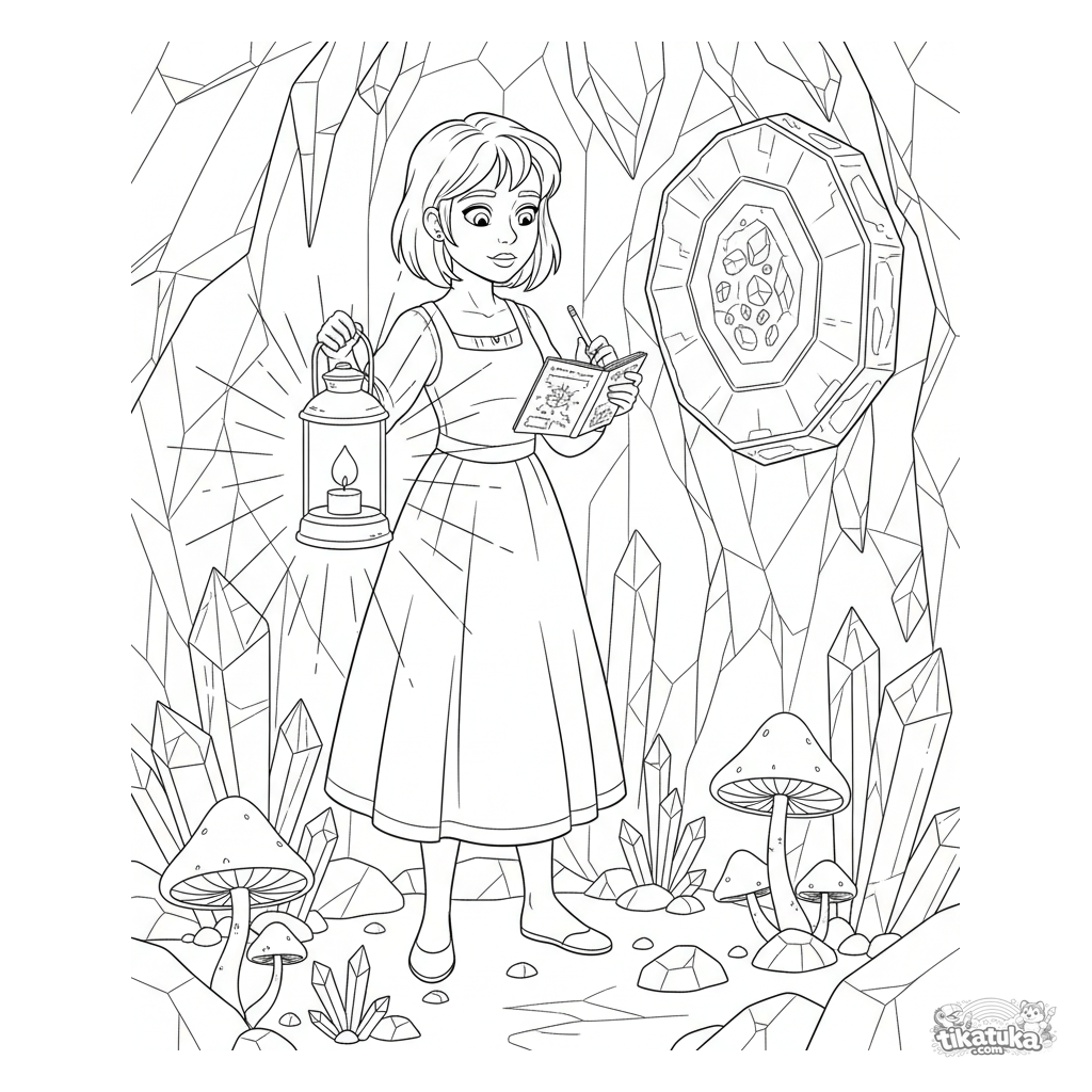 Página para colorir complexa para meninas 10-12 anos: uma princesa exploradora estuda cristais brilhantes em uma caverna. Alto detalhamento.