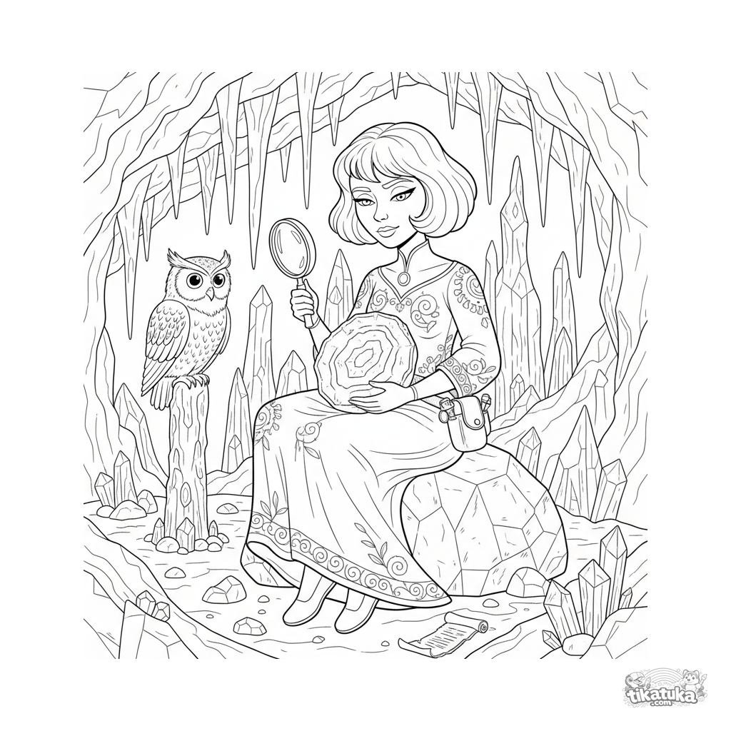 Página para colorir para crianças mais velhas 10-12: uma princesa estudiosa examina uma geoda brilhante dentro de uma caverna de cristal, com uma coruja.