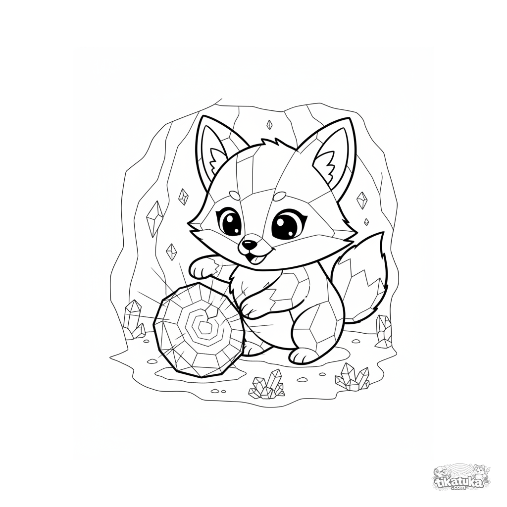 Página para colorir para pré-adolescentes 7-9: um filhote de raposa de cristal brinca com uma geoda brilhante em uma caverna mágica. Estilo anime com detalhes expressivos.