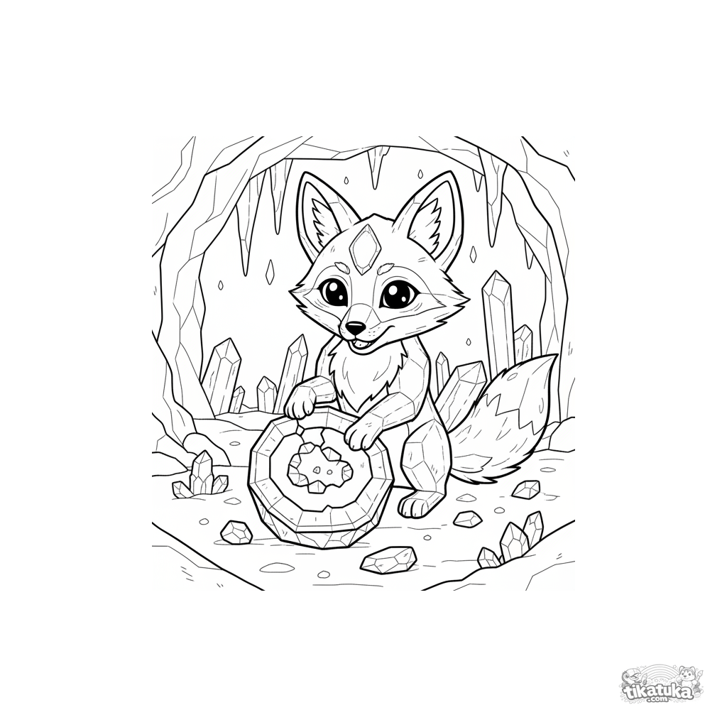 Página para colorir para crianças 4-6: um filhote de raposa de cristal brinca com um geodo em uma caverna cintilante. Criatura de fantasia única em um cenário mágico, contornos limpos, margens amplas.