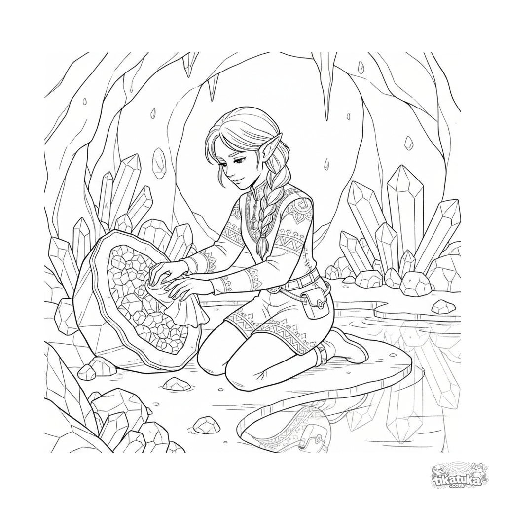 Página para colorir detalhada de um elfo guardião de cristais polindo um geodo em uma gruta subterrânea brilhante. Para crianças de 10-12 anos.