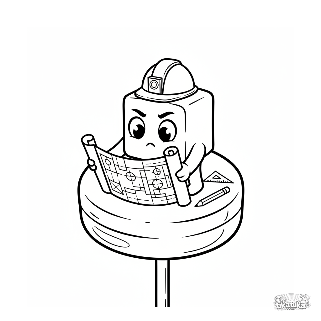 Página para colorir para crianças maiores 10-12: um microbio em forma de cubo com capacete estuda uma planta para uma futura construção num pirulito.