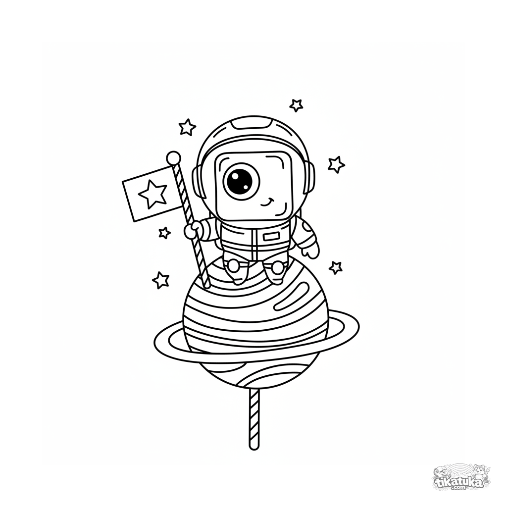 Página para colorir para crianças 7-9: um micróbio em forma de cubo em traje espacial explora a superfície de um pirulito como um planeta alienígena. Cena com clima espacial e estrelas de doces.