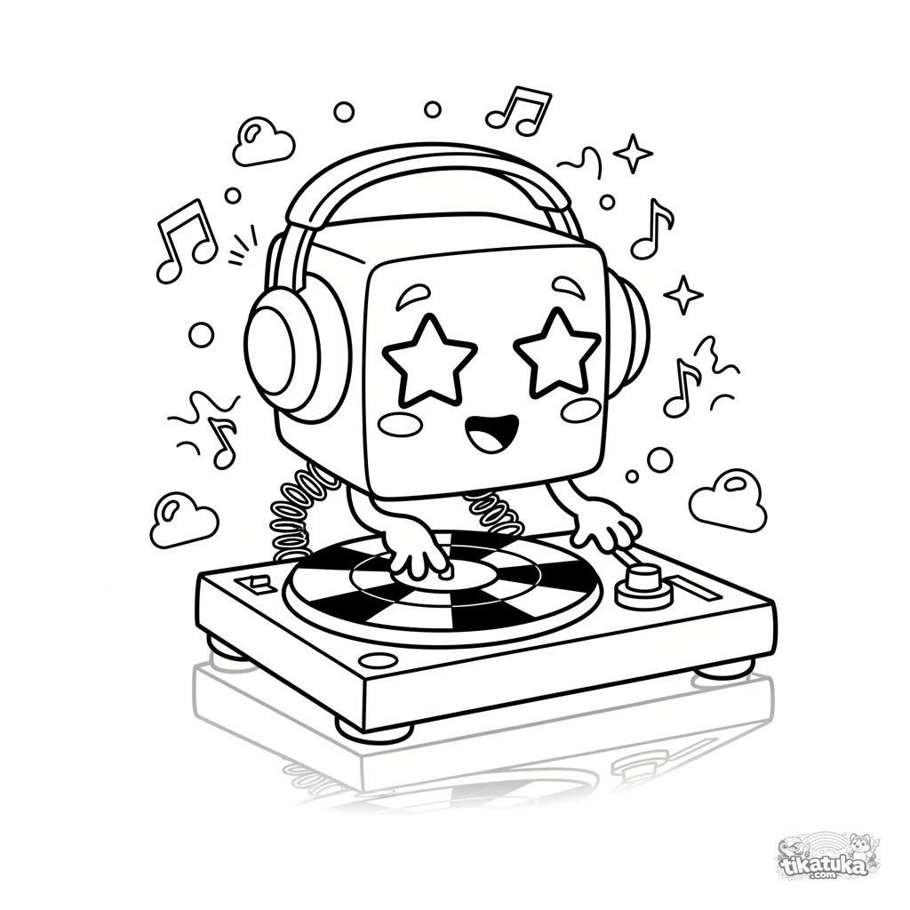 Página para colorir para crianças 7-9: um micróbio em forma de cubo com fones de ouvido toca música em um toca-discos de doce, sobre um pirulito gigante.