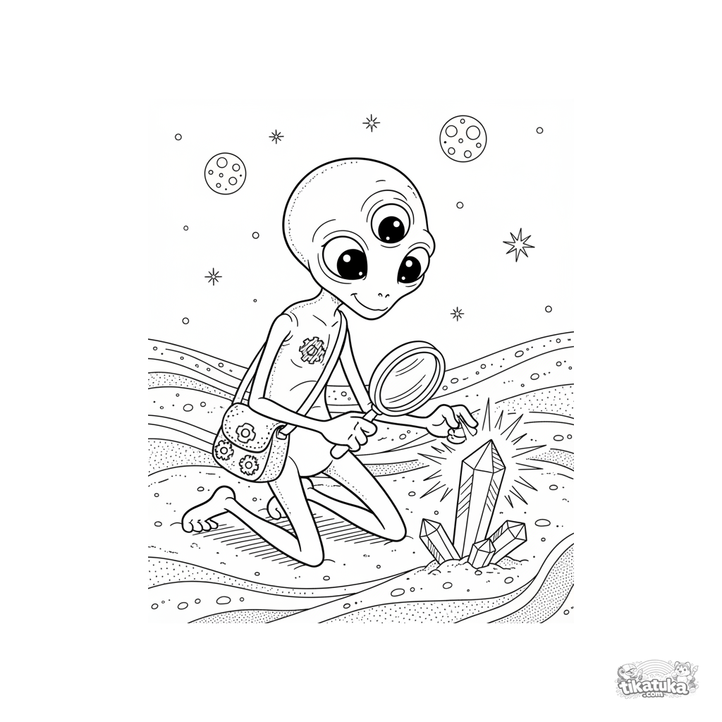 Página para colorir de um arqueólogo alienígena examinando cristais num planeta deserto. Cena de ficção científica detalhada para crianças de 7 a 12 anos.