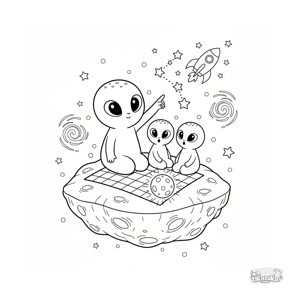 Página para colorir para 4-6 anos: uma família alienígena fofa sentada em um asteroide no espaço sideral, olhando para as estrellas. Formas simples e amigáveis.