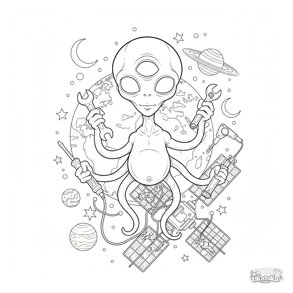 Página para colorir espacial detalhada: um alienígena curioso com tentáculos conserta um satélite em órbita ao redor da Terra. Para 7-12 anos.