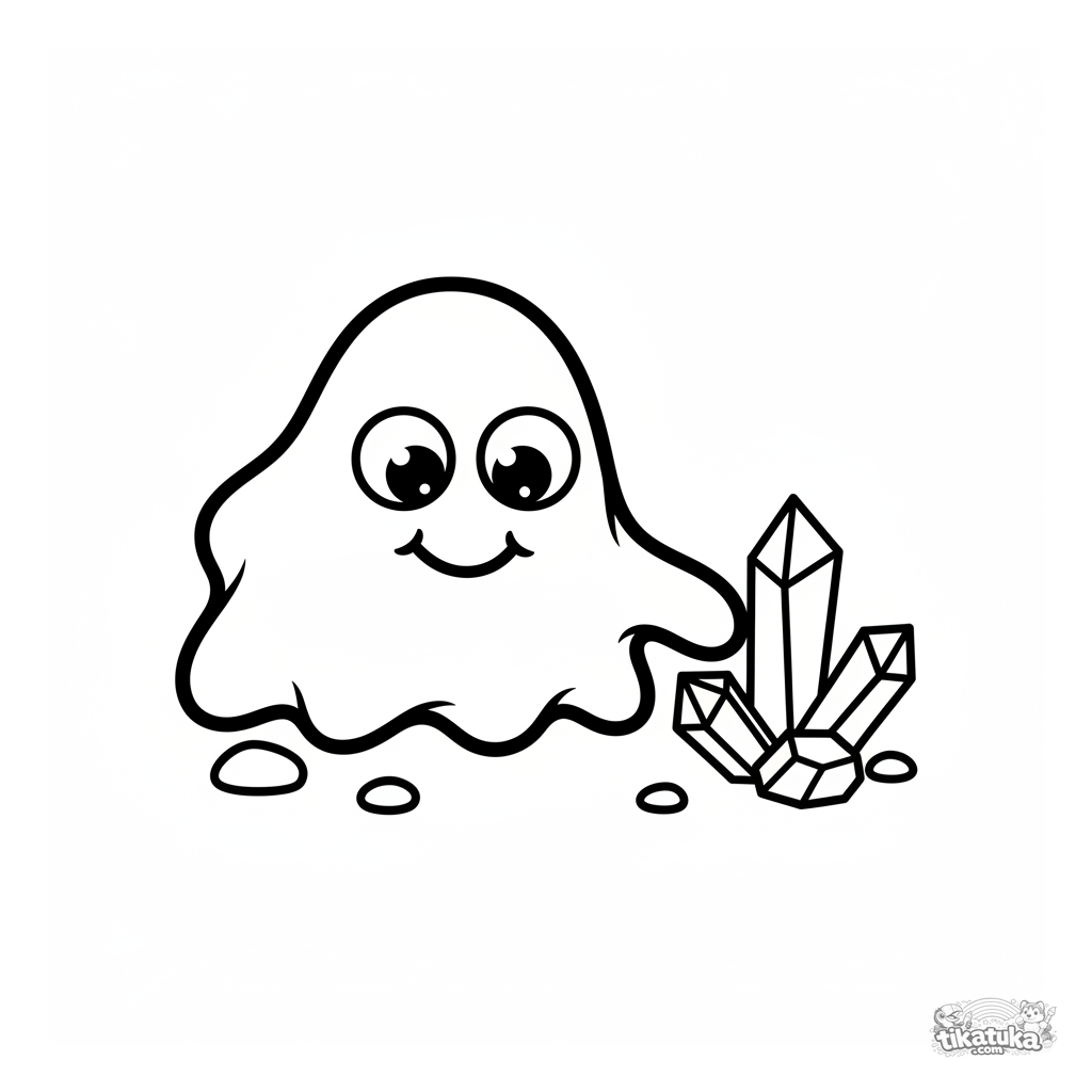 Página para colorir para crianças pequenas de 2-3 anos: uma ameba amigável com olhos grandes explora cristais. Formas muito simples, grandes detalhes, margens amplas.