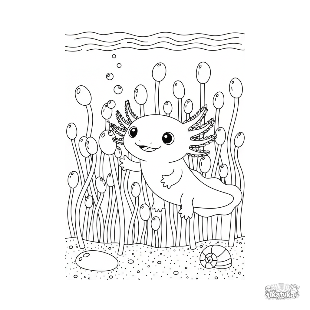 Página para colorir para crianças de 4-6 anos: um axolote fofo explora plantas subaquáticas brilhantes. Cena subaquática mágica com bolhas.