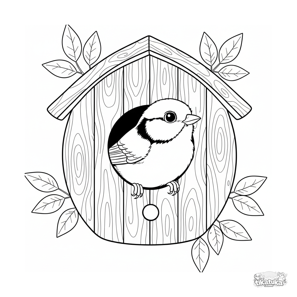 Página para colorir para crianças 7-9: um chapim curioso a espreitar pelo buraco redondo de uma casa de pássaros de madeira. Ilustração detalhada.