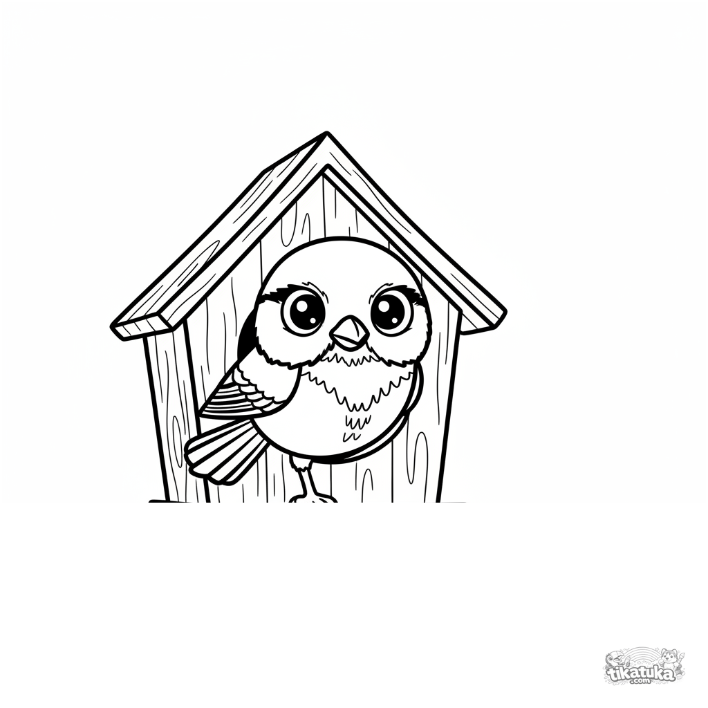Página para colorir simples para crianças pequenas 2-3: um fofo chapim com olhos grandes espreita pelo buraco redondo de uma casa de pássaros de madeira. Formas grandes e claras.