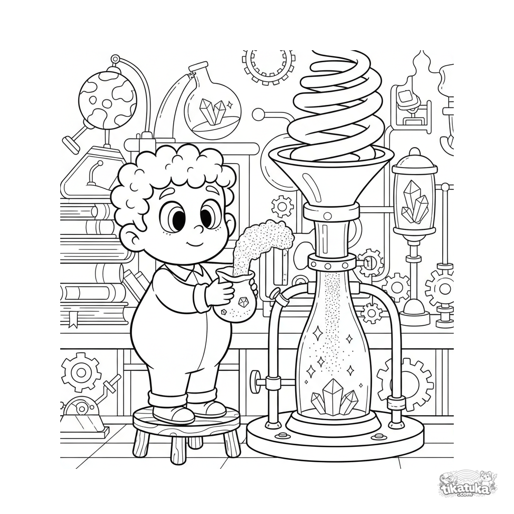Página para colorir para crianças 4-6: um menino em um laboratório secreto despeja pó brilhante em uma máquina de cultivar cristais. Tubos de vidro, bobinas de cobre, banquinho.