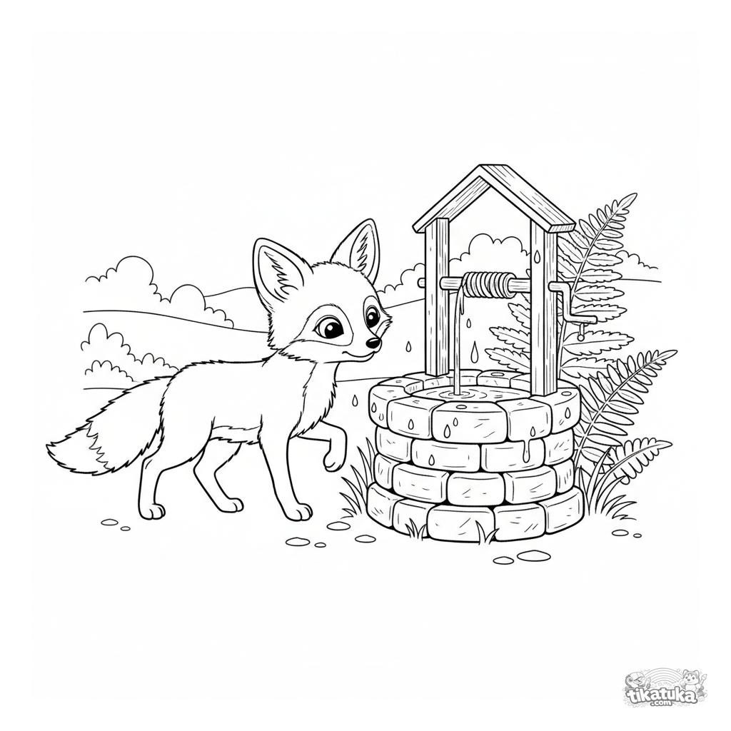 Página para colorir para crianças 7-9: um filhote de raposa cauteloso se aproxima do poço de água viva numa trilha da floresta. Cena no estilo gravura vintage.