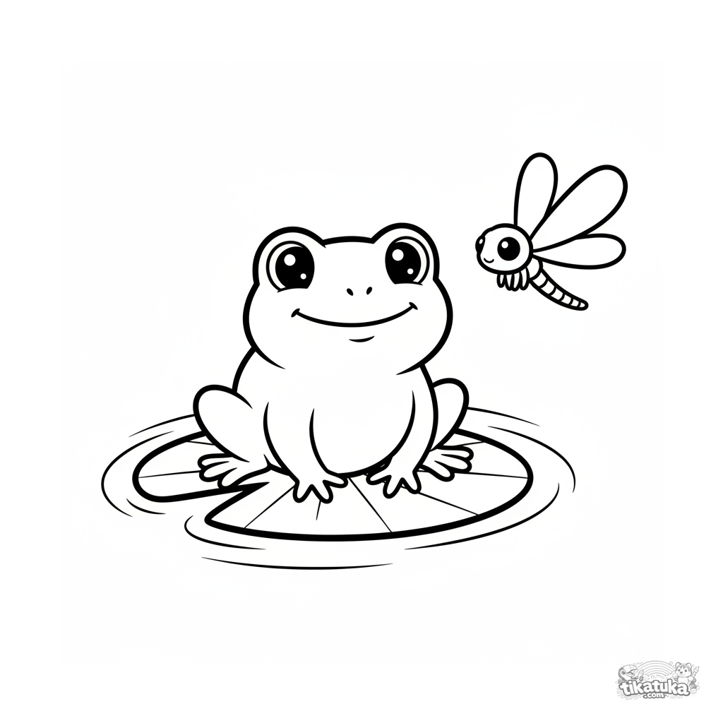 Página para colorir simples para crianças pequenas de 2-3 anos: um sapo sentado em uma vitória-régia em um riacho. Formas grandes e claras, poucos detalhes.
